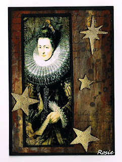 I used original rust (Creavil - pls. watch this Video), Black, Brown, Silver, and Gold Acrylic paint and rubberstamps in the background. The image is a Freebee by Moonlight Journey. The stars are dies from Tim Holtz and embossed in Gold.